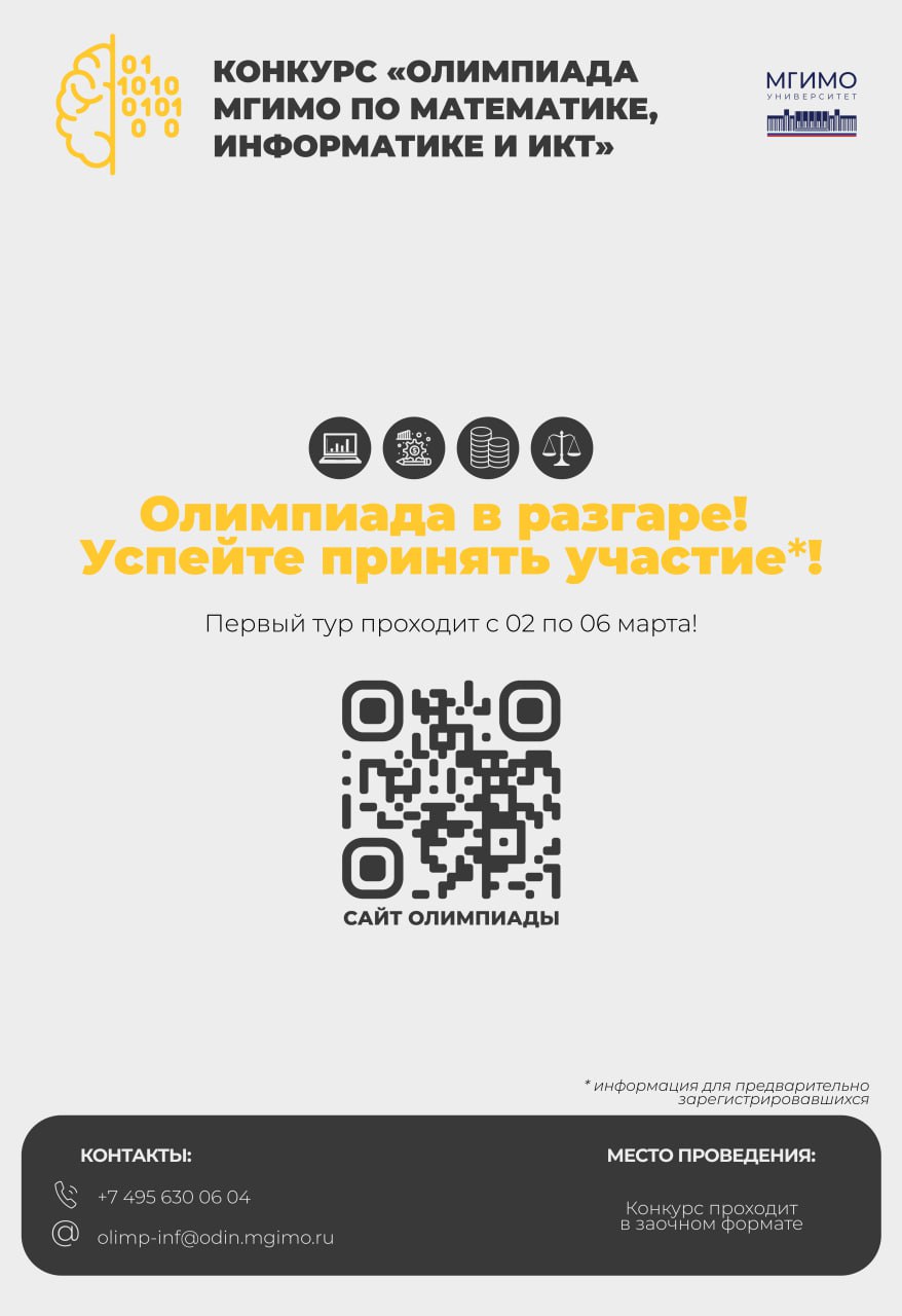Новости🔥 Прямо сейчас проходит первый тур конкурса «Олимпиада МГИМО по математике, информатике и информационно-коммуникационным технологиям» ✨ К участию п...