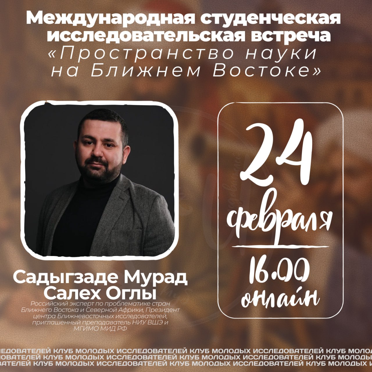 Гостем встречи станет Садыгзаде Мурад Салех Оглы — российский эксперт по проблематике стран Ближнего Востока и Северной Африки, президент Центра ближневосточных исследователей, приглашённый преподаватель НИУ ВШЭ и МГИМО МИД РФ.